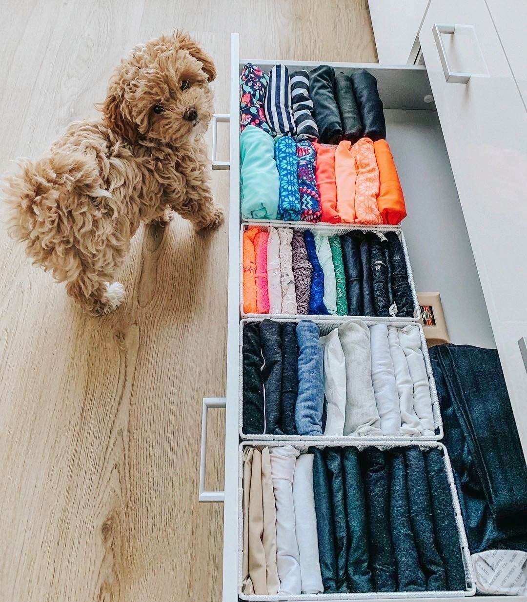 Dopo aver fatto la cernita e “salutato” i capi che non conserveremo, arriva il momento di piegare correttamente gli abiti. Secondo il metodo Konmari, quasi tutti gli indumenti devono essere piegati in modo a formare un rettangolo che stia “in piedi da solo”. Piegando con cura i capi in questo modo, avrete tutto a portata di mano e a vista: vi basterà dare una rapida occhiata al cassetto per decidere l’outfit del giorno.
