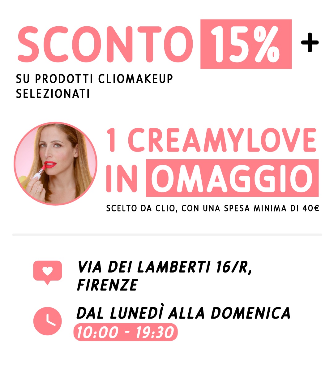 E non è finita qui: con una spesa minima di € 40.00, avrete un rossetto cremoso CreamyLove scelto da Clio in OMAGGIO!