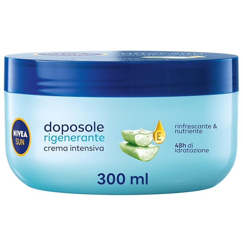 Texture decisamente più corposa e nutritiva è quella della nuova Crema Doposole Intensiva Nivea Sun. La formula arricchita con aloe vera bio, acido ialuronico e vitamina E riesce a lenire immediatamente la pelle, prevenendo le antiestetiche spellature.