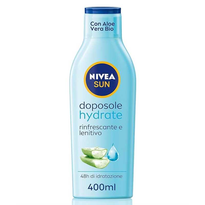 Promette fino a 48 ore di idratazione il latte Hydratate Nivea, un doposole da supermercato facile da reperire e super leggero sulla pelle. La formula, arricchita da aloe vera e acido ialuronico, assicura un effetto lenitivo e rinfrescante.