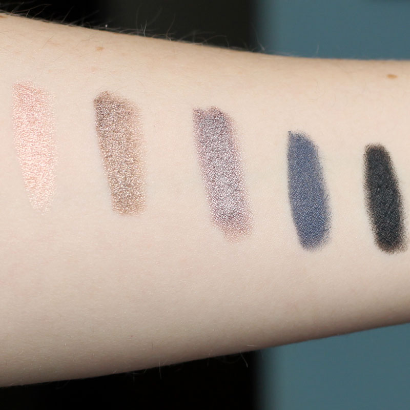 Da sinistra: 02 Peach perfect, 01 Go bro’nze, 06 She’s got the mauve, 05 I’m blue, 04 Black to the routes. Swatch realizzato con luce naturale, colori sfumati.