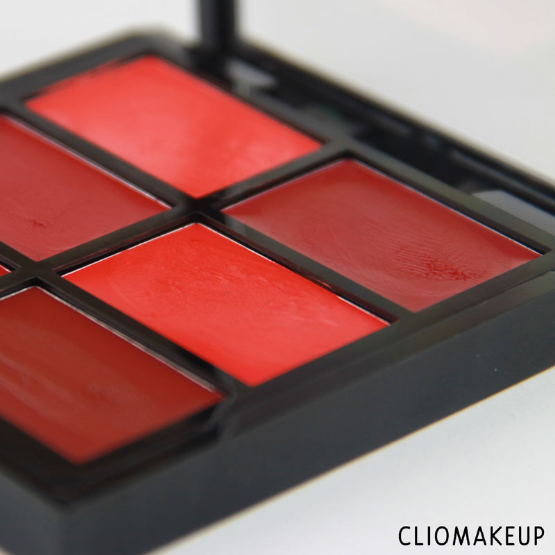 A titolo informativo vi elenchiamo qui di seguito gli ingredienti della palette: Ethylhexyl Palmitate, Octyldodecanol, Polybutene, Bis-Diglyceryl Polyacyladipate-2, Isostearyl Isostearate, Polyglyceryl-2 Triisostearate, Polymethyl Methacrylate, Hydrogenated Microcrystalline Wax, Copernicia Cerifera (Carnauba) Wax/Cera Carnauba/Cire de Carnauba, Diisostearyl Malate, Ozokerite, Beeswax/Cera Alba/Cire d’Abeille, Silica, Polyethylene, Octyldodecyl Stearoyl Stearate, Euphorbia Cerifera (Candelilla) Wax/Candelilla Cera/Cire de Candelilla, Tocopheryl Acetate, Alumina, BHT, Aluminum Hydroxide, Aluminum Benzoate, Barium Sulfate (CI 77120). MAY CONTAIN / PEUT CONTENIR (+/-): Mica, Titanium Dioxide (CI 77891), Iron Oxides (CI 77491, CI 77492, CI 77499), Red 6 (CI 15850), Red 7 (CI 15850), Red 28 Lake (CI 45410), Blue 1 Lake (CI 42090), Red 36 (CI 12085), Yellow 5 Lake (CI 19140), Red 27 (CI 45410).