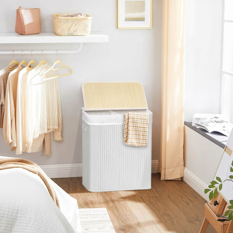 Qui possiamo collocare un cesto per la biancheria sporca e un piccolo bidoncino per gettare via i rifiuti.