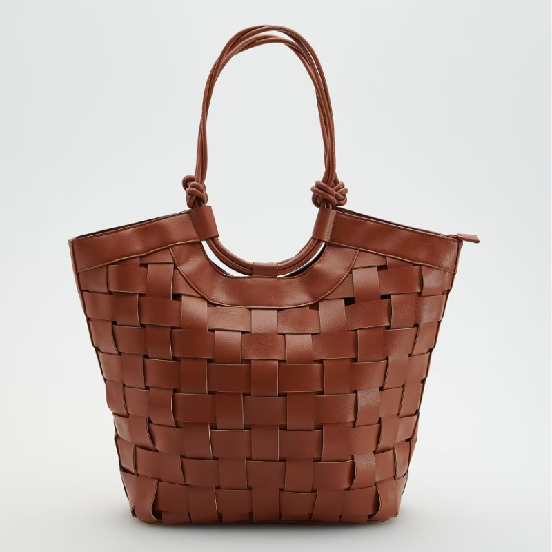 Per il giorno questa shopping bag riprende l’intreccio delle borse più cool del momento ma non rinuncia alla praticità grazie alla sua capienza. In color cognac è perfetta per l’estate per evitare la classica borsa nera.