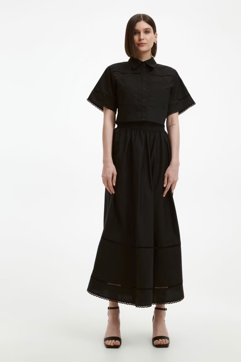 Sempre nel modello midi, la gonna nera in cotone con inserti in pizzo ci catapulta alla sere estive. Elegante, ma indossabile anche di giorno con delle t-shirt per look più casual, è un pezzo immancabile must have della stagione.