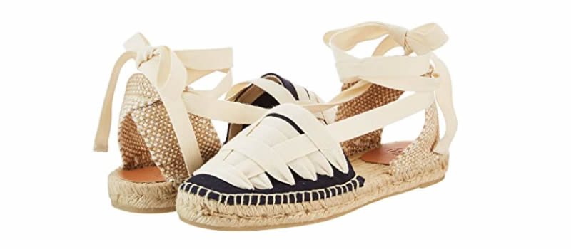 Non mancano le espadrillas alla schiava, anche queste molto semplici nel design ma deliziose in quanto abbellite da due laccetti, che si incrociano lungo la gamba.